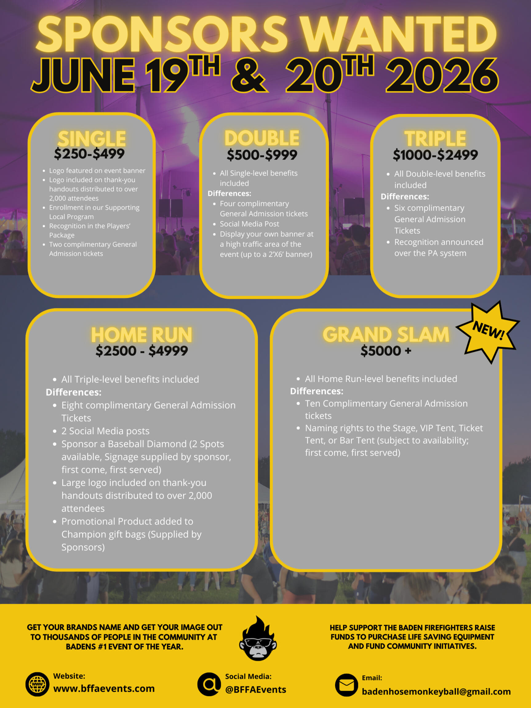 The Baden Hosemonkey Tournament and Concert Series is more than just a tournament and concert. It is a community driven event built on the values of community, collaboration, and safety. Each year, we bring people together for an unforgettable weekend while raising funds to purchase life saving fire and rescue equipment and support important local community initiatives.Our mission has always been about giving back and strengthening the safety and well being of our community while creating meaningful partnerships with the incredible businesses that call this area home.While we have proudly offered sponsorship opportunities in the past, we are now expanding our program to better support and promote the amazing companies in our community. We offer a wide range of sponsorship levels designed to fit businesses of all sizes, and we are committed to creating value that extends beyond event weekend. From comprehensive promotional packages to take home perks that showcase your support for local causes, we want to make sure everyone who walks through your doors knows you stand behind your community.We have helped many businesses grow their visibility and community presence, and now we are ready to do even more. Together, we can continue building a safer, stronger, and more connected community.